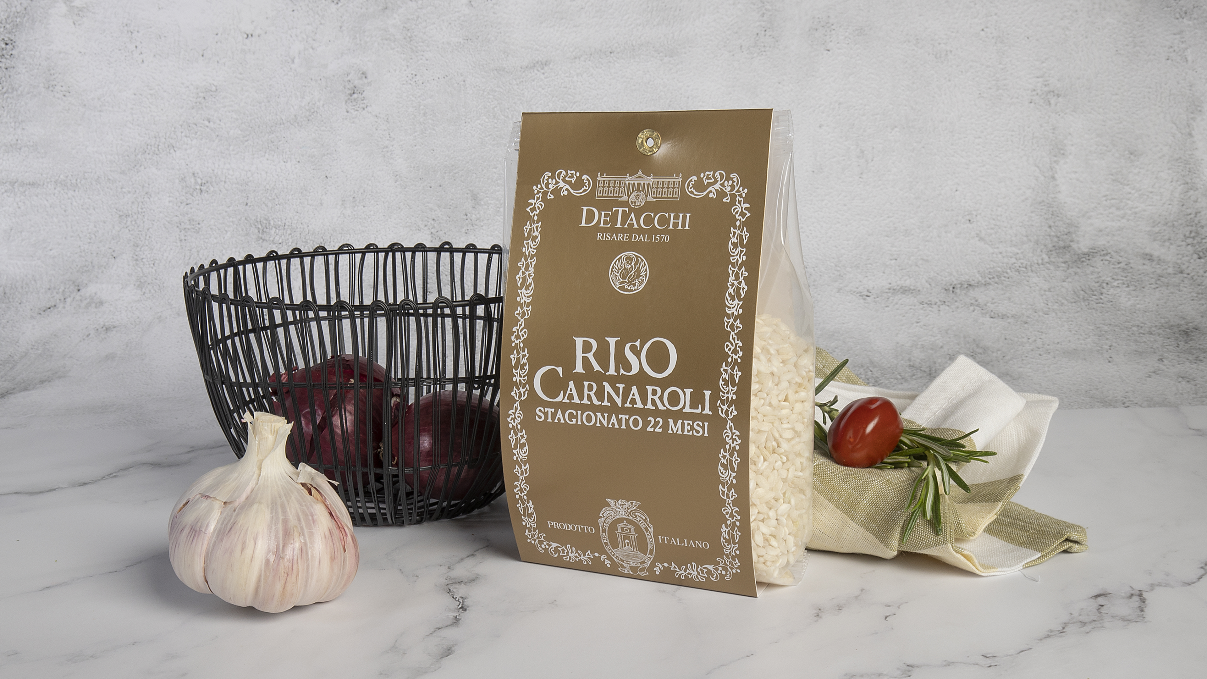Carnaroli-Reis ist ein sehr feiner italienischer Reis, der sich durch ein langes Korn, einen hohen Stärkegehalt und hervorragende Kocheigenschaften auszeichnet - alles Eigenschaften, die Carnaroli den Beinamen "König des Reises" eingebracht haben. Auch der Reis von Francesco De Tacchi reift 22 Monate lang in speziell belüfteten Silos, in denen das "lebende" Reiskorn, der so genannte „risone“, dehydriert und verdichtet wird, wobei es die im Keim enthaltenen Öle und das Vitamin A aus der äußeren "Schale" aufnimmt, die ihm auch eine charakteristische gelbliche Farbe verleiht. Dies ist ein völlig natürlicher Prozess, der die Eigenschaften des Reiskorns hervorhebt und ihm außerdem eine außergewöhnliche Fähigkeit verleiht, während des Kochens aufzugehen, was ihn besonders für die Zubereitung von Risotto geeignet macht.