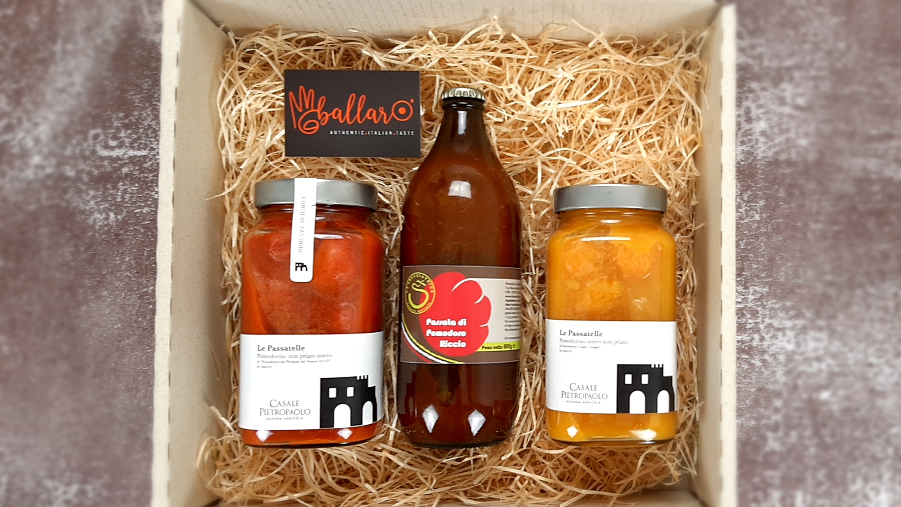 Die Geschenkebox "L'oro del sud" (dt. das Gold des Südens) ist eine Kombination aus drei Tomatensorten, die in Kampanien angebaut werden und für phantasievolle Kombinationen und für Liebhaber guter Dinge gedacht sind. Darin finden Sie ein Glas "Le passatelle" aus der Tomate Piennolo, ein Glas "Le passataelle" aus der Tomate Giagiù und eine Flasche Riccio-Tomatensauce.