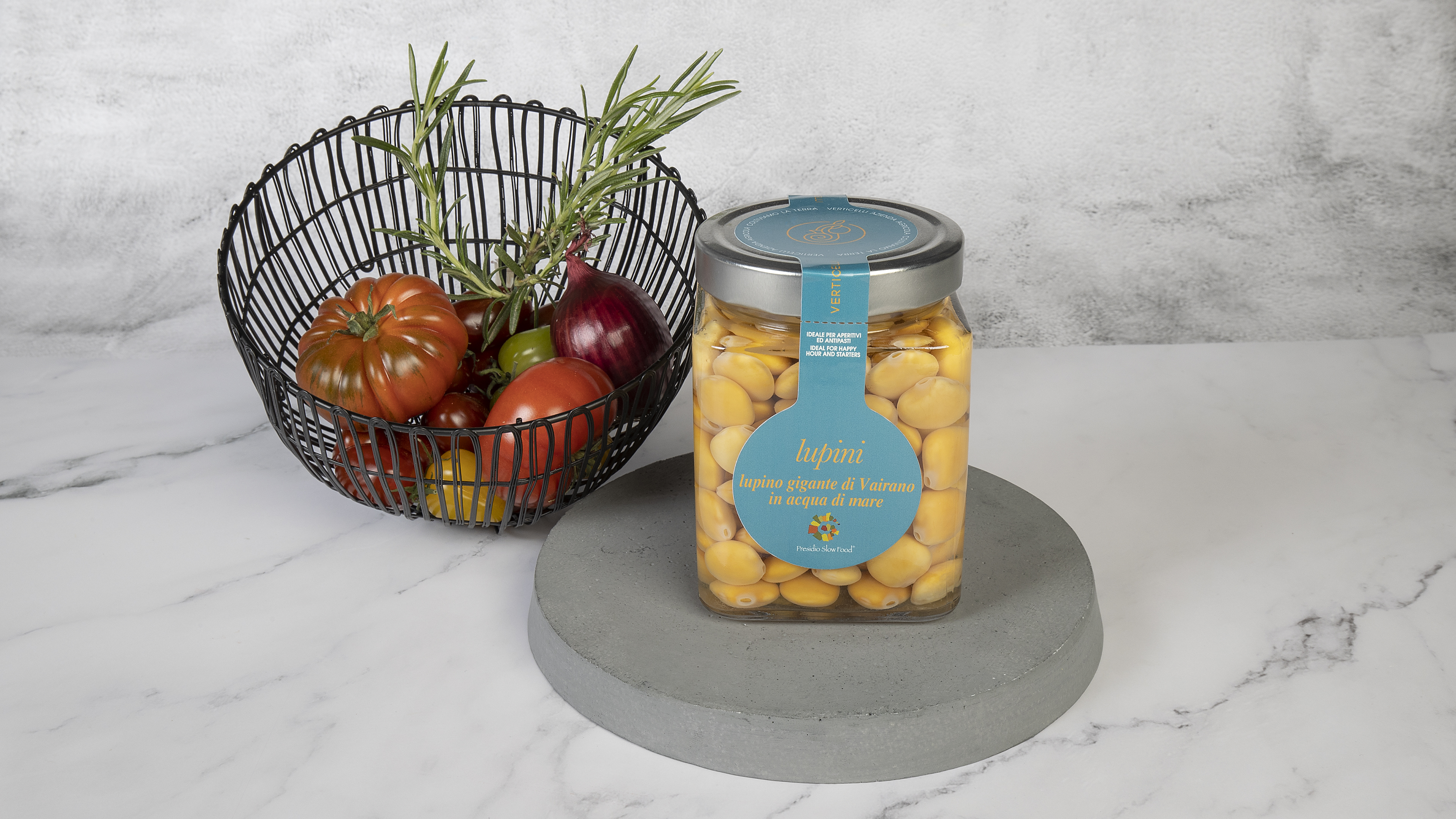 Die Riesenlupine von Vairano, die von Mario Parente an der Grenze zwischen Kampanien und Latium angebaut wird, gehört zum Slow Food-Presidio und zeichnet sich durch ihre Größe und ihren intensiven Geschmack aus. Sie wird in aufbereitetem Wasser konserviert und eignet sich hervorragend als Snack oder Vorspeise.