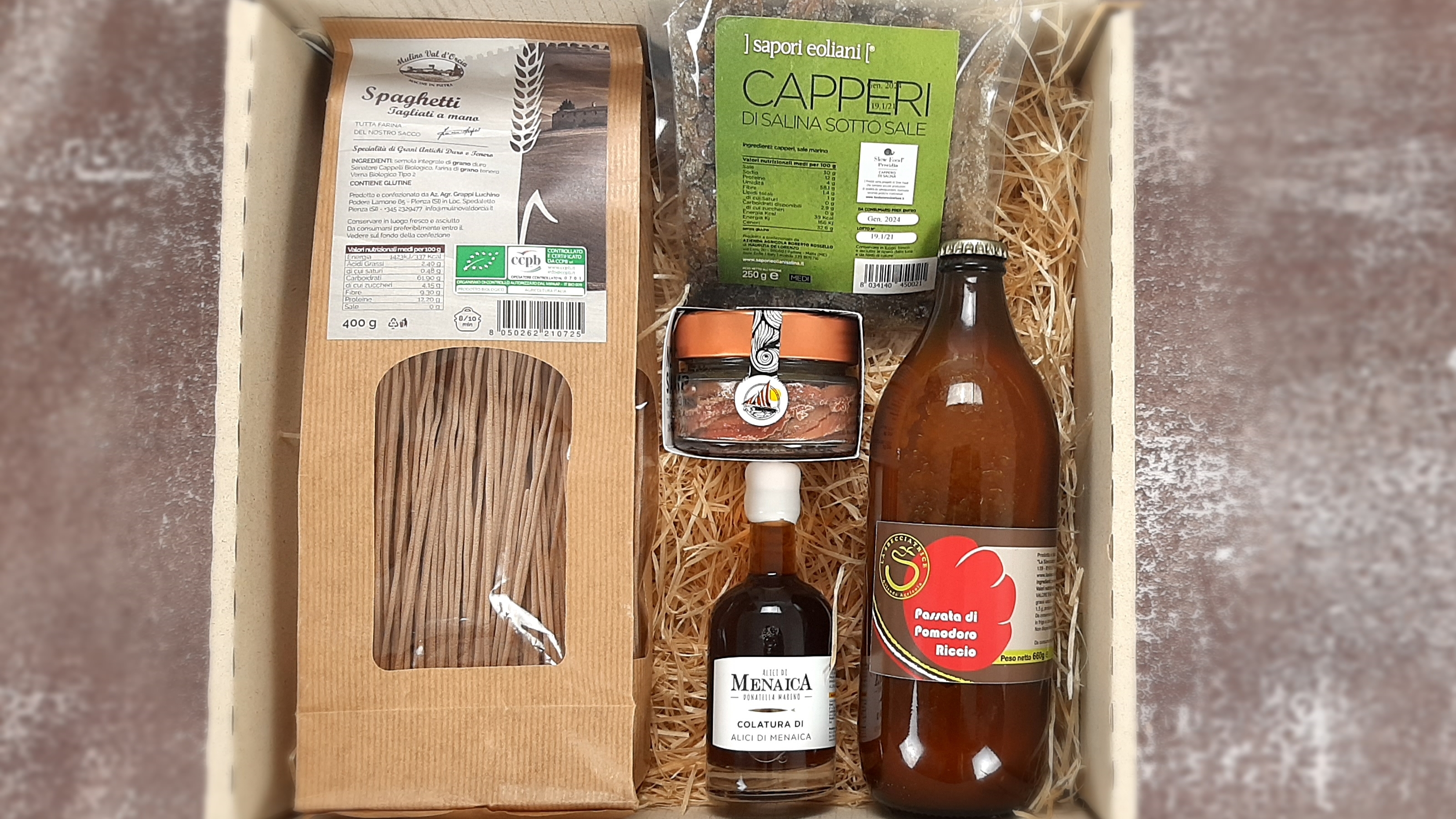 Diese Geschenkbox "Spaghetti alla marinara" ist für die Liebhaber der Pasta gedacht, die die Geschmäcker unseres geliebten Mittelmeers schätzen. Diese Box führt uns in einen Kurzurlaub der italienischen Atmosphäre.